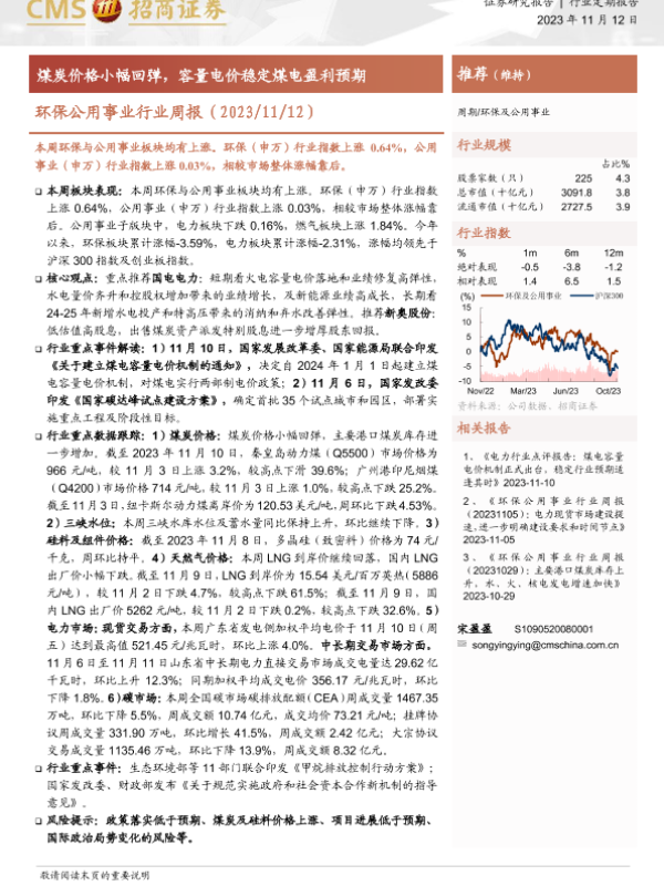 【海通证券】【20231112】环保公用事业行业周报:煤炭价格小幅回弹,容量电价稳定煤电盈利预期-19页