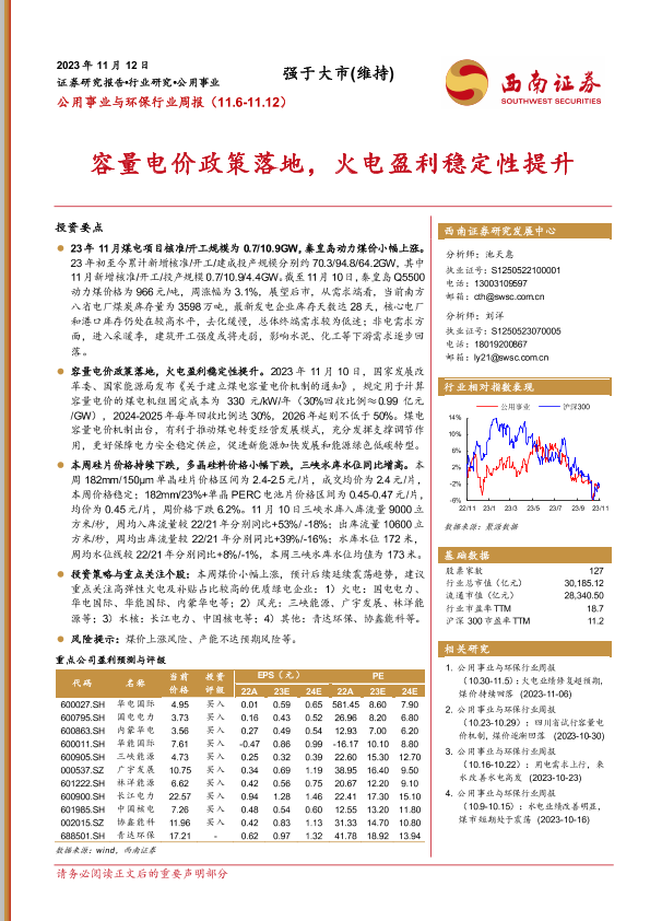 【西南证券】【20231112】公用事业与环保行业周报:容量电价政策落地,火电盈利稳定性提升-20页