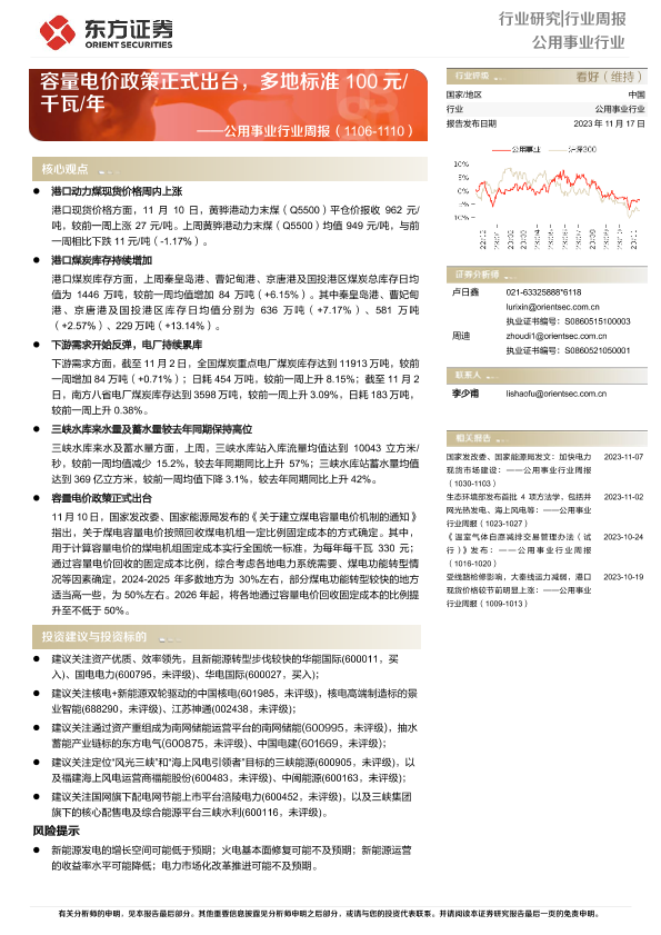 【东方证券】【20231117】公用事业行业周报:容量电价政策正式出台,多地标准100元 千瓦 年-16页