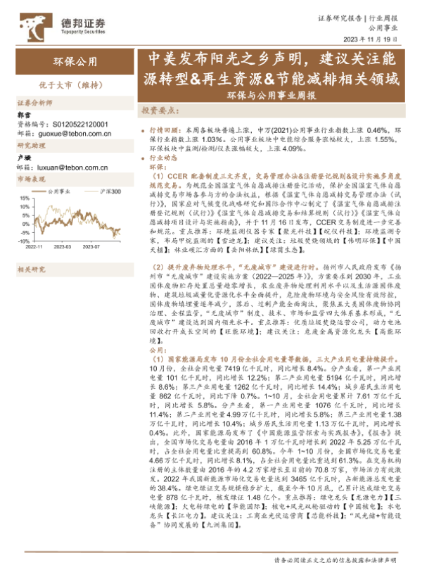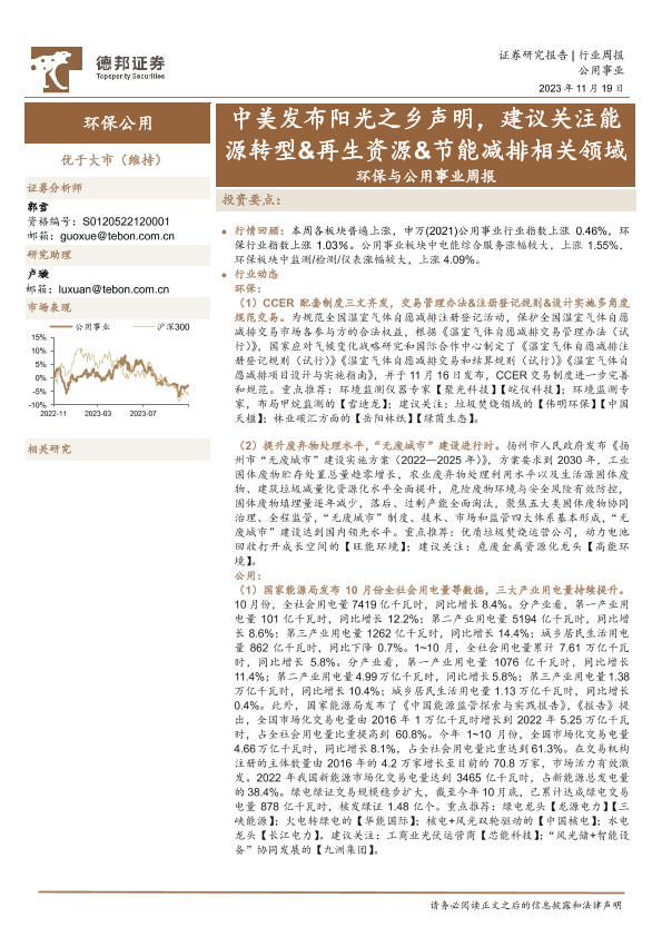 【德邦证券】【20231119】环保与公用事业周报:中美发布阳光之乡声明,建议关注能源转型&再生资源&节能减排相关领域-20页