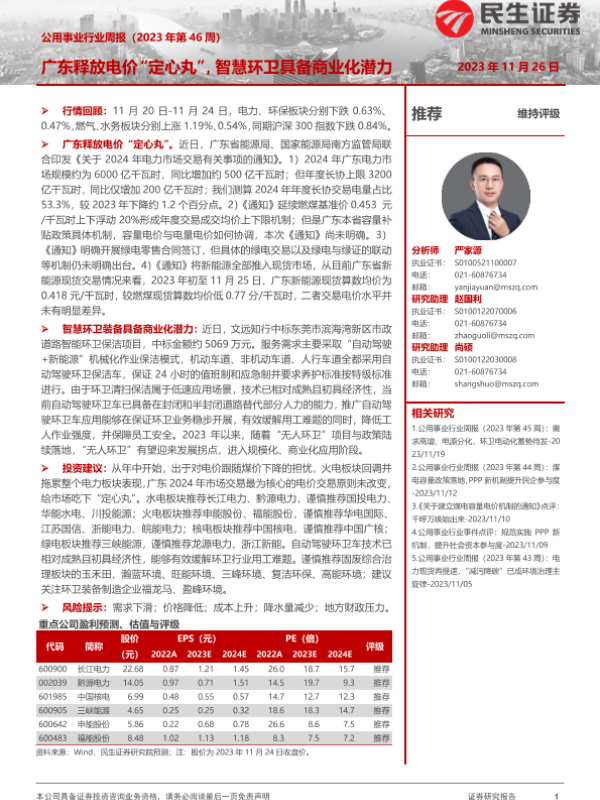 【民生证券】【20231126】公用事业行业周报:广东释放电价“定心丸”,智慧环卫具备商业化潜力-26页