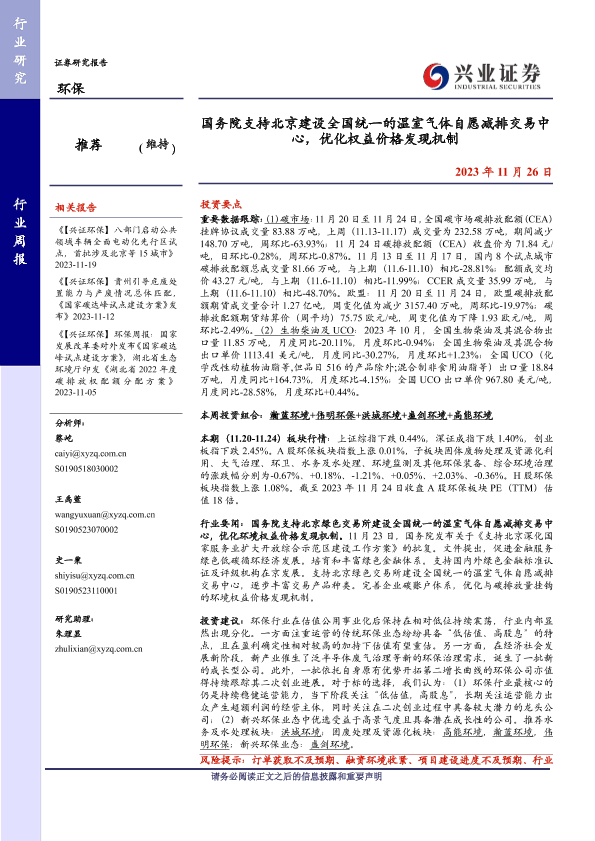 【兴业证券】【20231126】国务院支持北京建设全国统一的温室气体自愿减排交易中心,优化权益价格发现机制-10页
