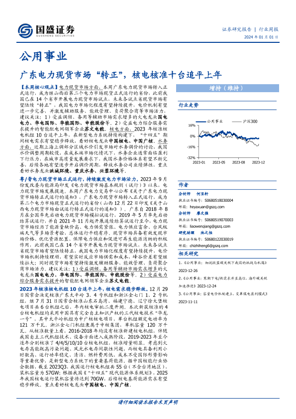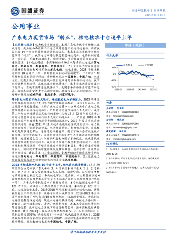 【国盛证券】【20240101】公用事业行业周报:广东电力现货市场“转正”,核电核准十台追平上年-10页