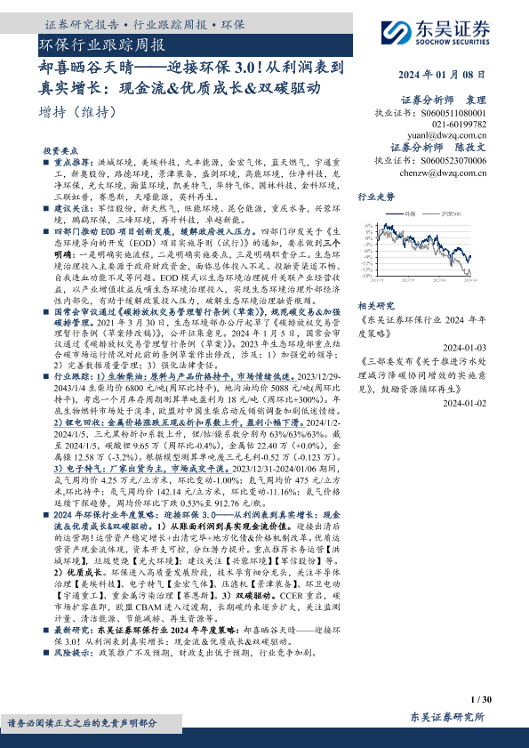 【东吴证券】【20240108】环保行业跟踪周报:却喜晒谷天晴——迎接环保3.0!从利润表到真实增长:现金流&优质成长&双碳驱动-30页