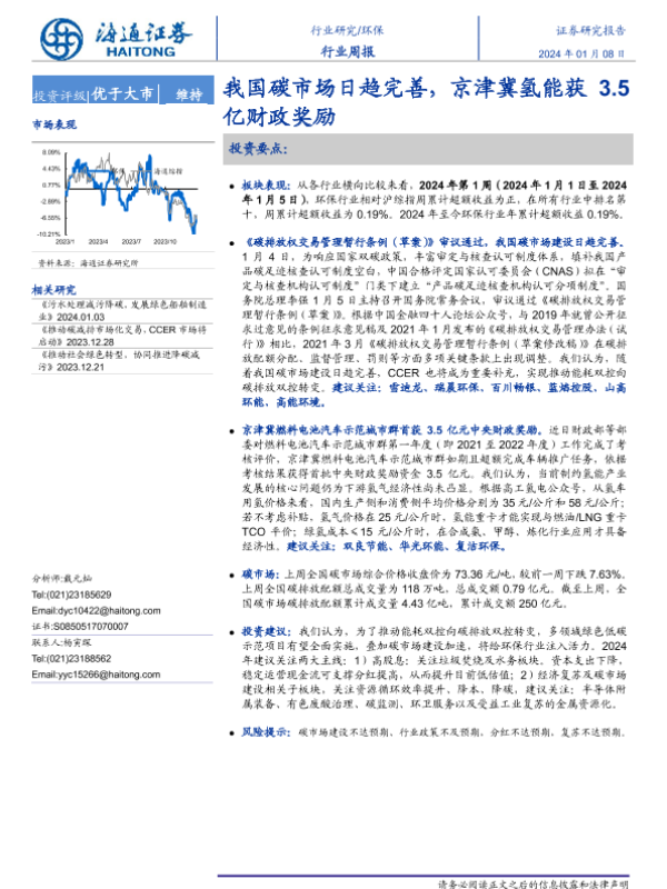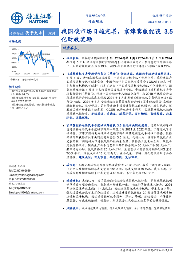 【海通证券】【20240108】环保行业周报:我国碳市场日趋完善,京津冀氢能获3.5亿财政奖励-13页