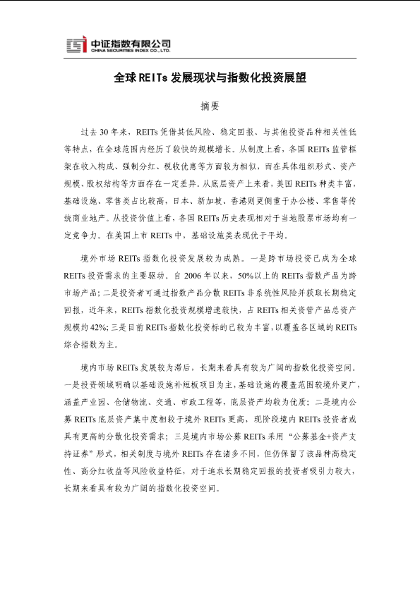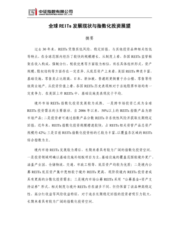 REITs REITS 全球发展 房地产信托投资基金 指数化投资