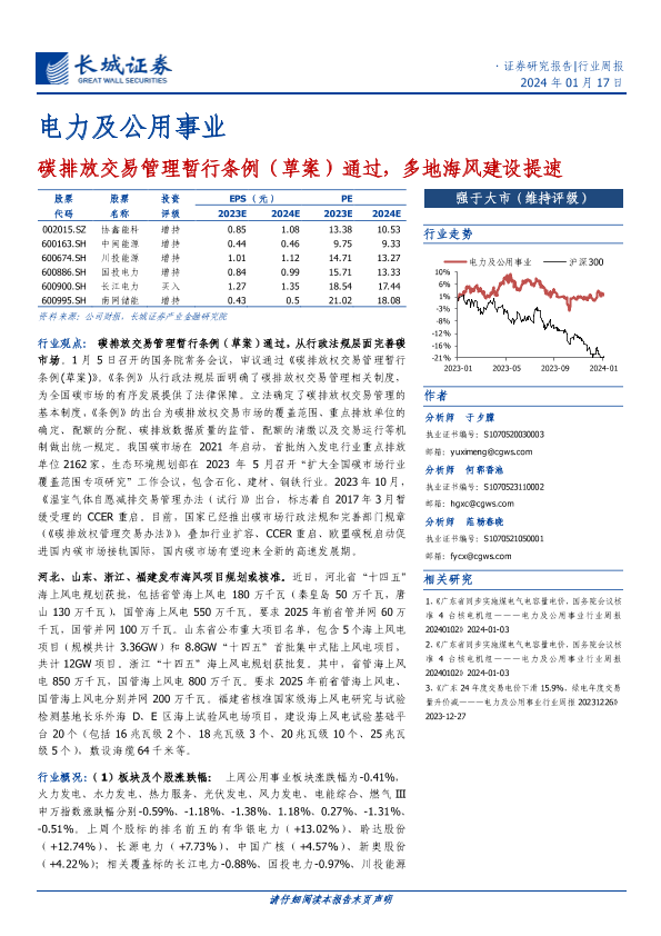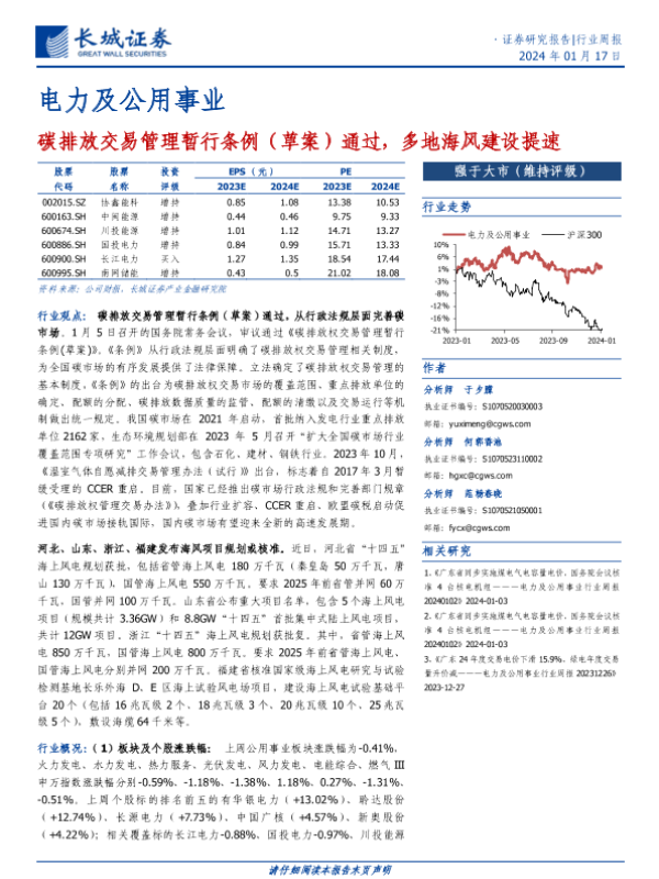 【长城证券】【20240117】电力及公用事业行业周报:碳排放交易管理暂行条例(草案)通过,多地海风建设提速-15页