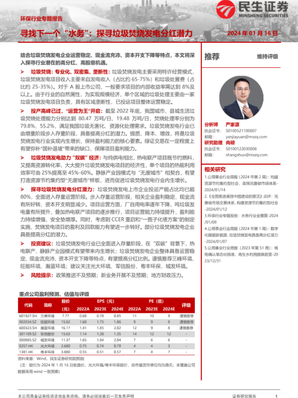 【民生证券】【20240116】寻找下一个“水务”:探寻垃圾焚烧发电分红潜力-27页