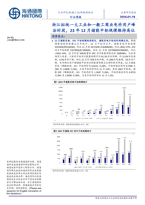 【海通国际】【20240119】新能源板块行业周报:浙江拟统一大工业和一般工商业电价用户峰谷时段,23年12月储能中标规模维持高位-10页