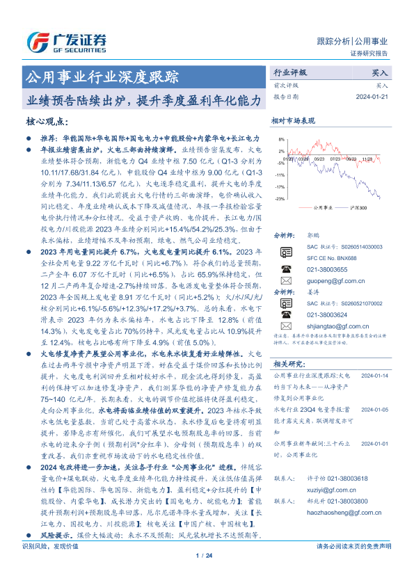 【广发证券】【20240121】公用事业行业深度跟踪:业绩预告陆续出炉,提升季度盈利年化能力-24页