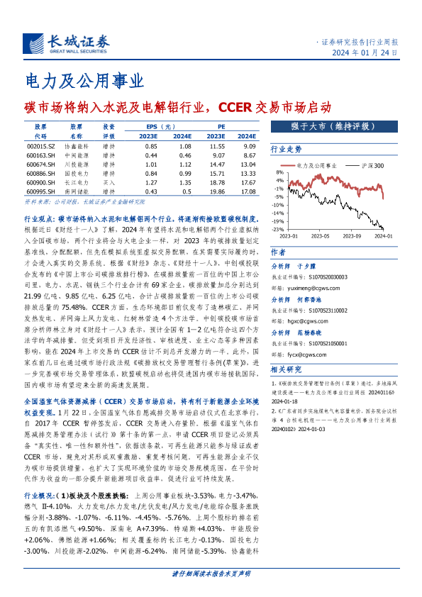 【长城证券】【20240124】电力及公用事业行业周报:碳市场将纳入水泥及电解铝行业,CCER交易市场启动-15页