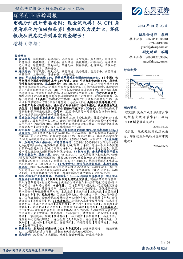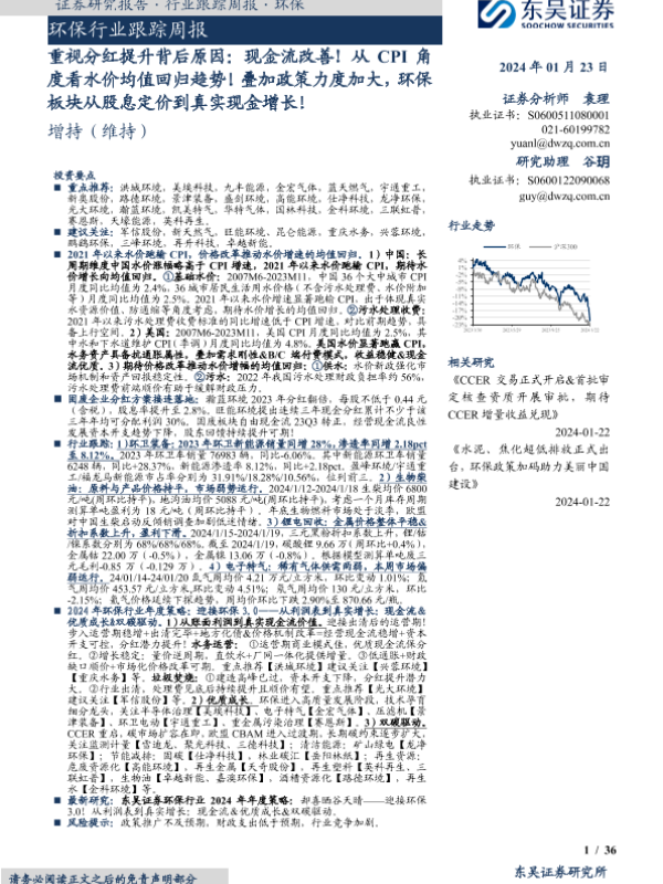【东吴证券】【20240123】环保行业跟踪周报:重视分红提升背后原因:现金流改善!从CPI角度看水价均值回归趋势!叠加政策力度加大,环保板块从股息定价到真实现金增长!-36页