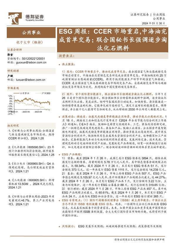 【德邦证券】【20240130】公用事业行业周报:ESG周报:CCER市场重启,中海油完成首单交易;联合国秘书长强调逐步淘汰化石燃料-14页