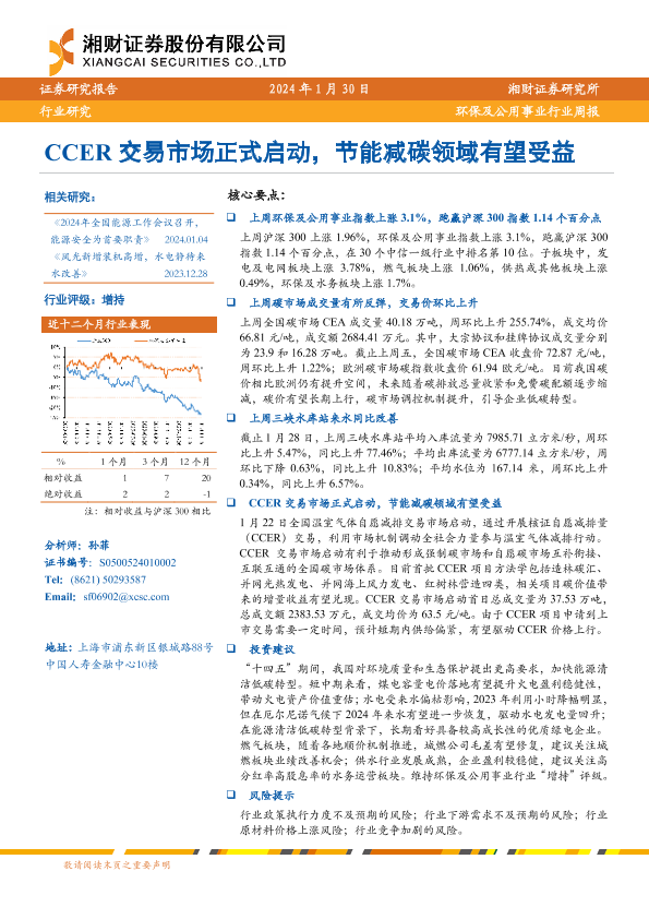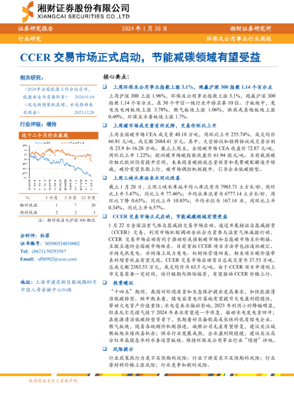 【湘财证券】【20240130】环保及公用事业行业周报:CCER交易市场正式启动,节能减碳领域有望受益-10页