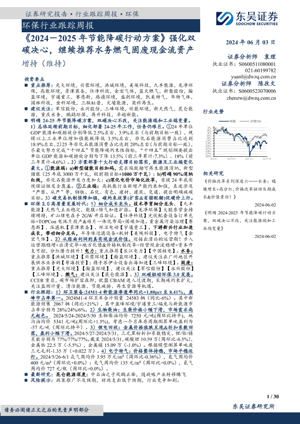 【东吴证券】【20240603】2024-2025年节能降碳行动方案强化双碳决心,继续推荐水务燃气固废现金流资产-30页