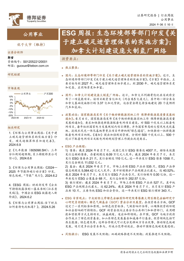 【德邦证券】【20240610】公用事业ESG周报:生态环境部等部门印发《关于建立碳足迹管理体系的实施方案》;加拿大计划建设庞大制氢厂网络-12页