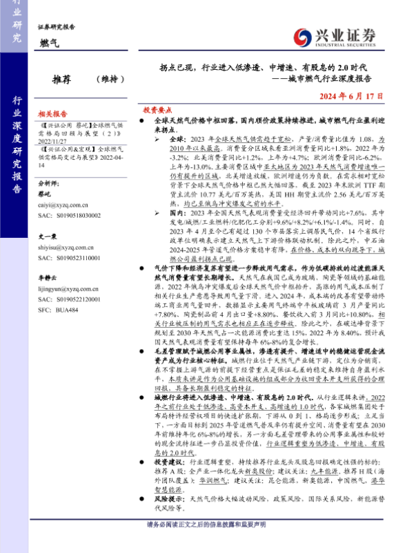 【兴业证券】【20240617】城市燃气行业深度报告:拐点已现,行业进入低渗透、中增速、有股息的2.0时代-26页