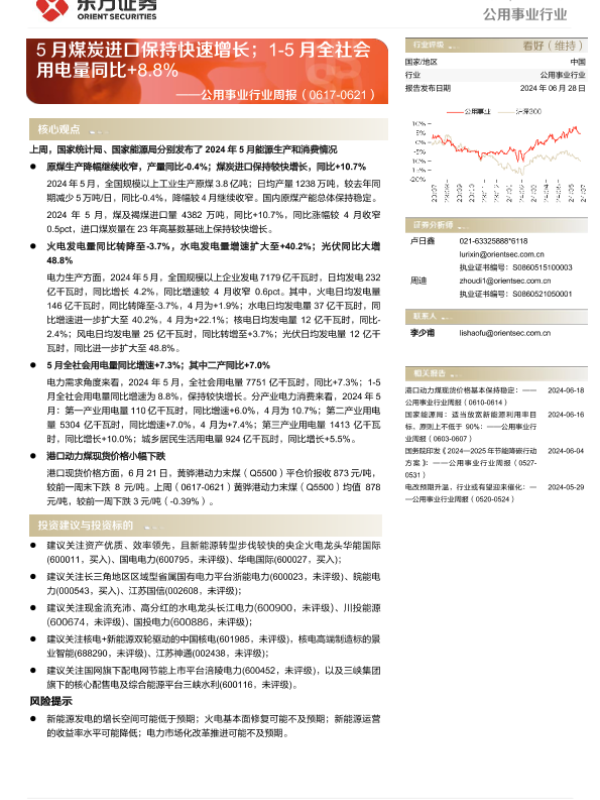 【东方证券】【20240628】公用事业行业周报:5月煤炭进口保持快速增长;1-5月全社会用电量同比+8.8%-17页