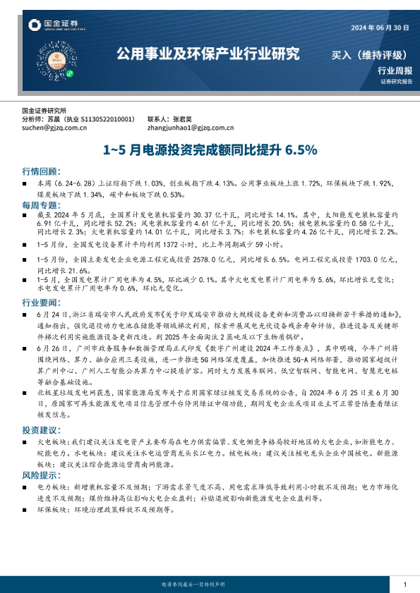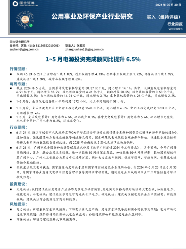 【国金证券】【20240630】公用事业及环保产业行业研究:1-5月电源投资完成额同比提升6.5%-15页