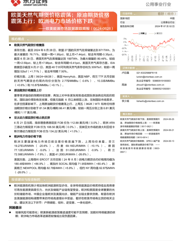 【东方证券】【20240702】欧美能源市场数据跟踪周报:欧美天然气期货价格震荡;原油期货价格震荡上行;欧洲电力市场价格下跌-12页
