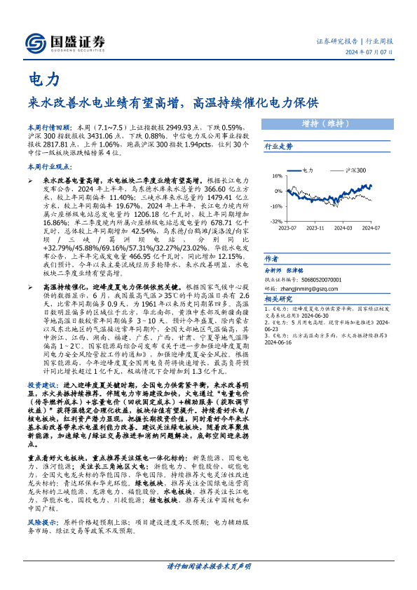 【国盛证券】【20240707】电力行业周报:来水改善水电业绩有望高增,高温持续催化电力保供-17页