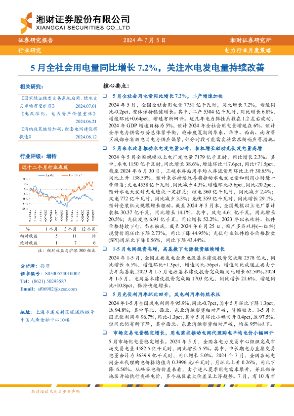 【湘财证券】【20240705】5月全社会用电量同比增长7.2%,关注水电发电量持续改善-30页