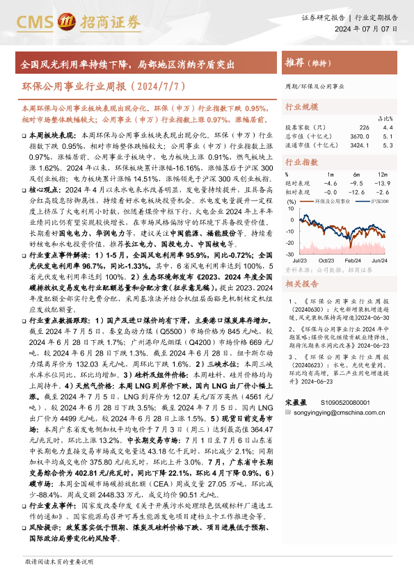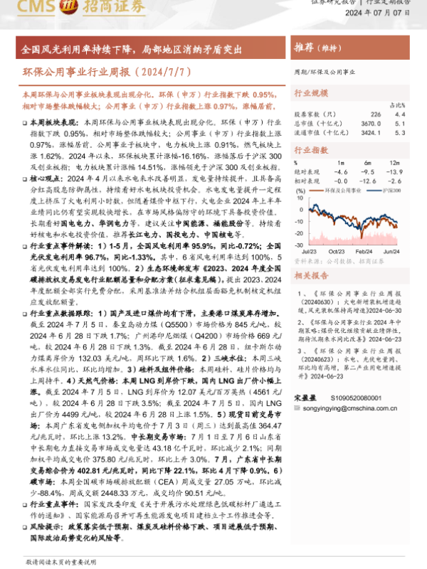 【海通证券】【20240707】环保公用事业行业周报:全国风光利用率持续下降,局部地区消纳矛盾突出-21页