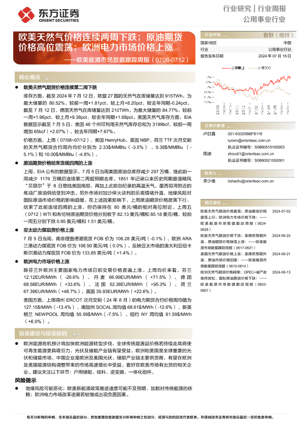 【东方证券】【20240716】欧美能源市场数据跟踪周报:欧美天然气价格连续两周下跌;原油期货价格高位震荡;欧洲电力市场价格上涨-12页
