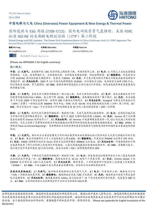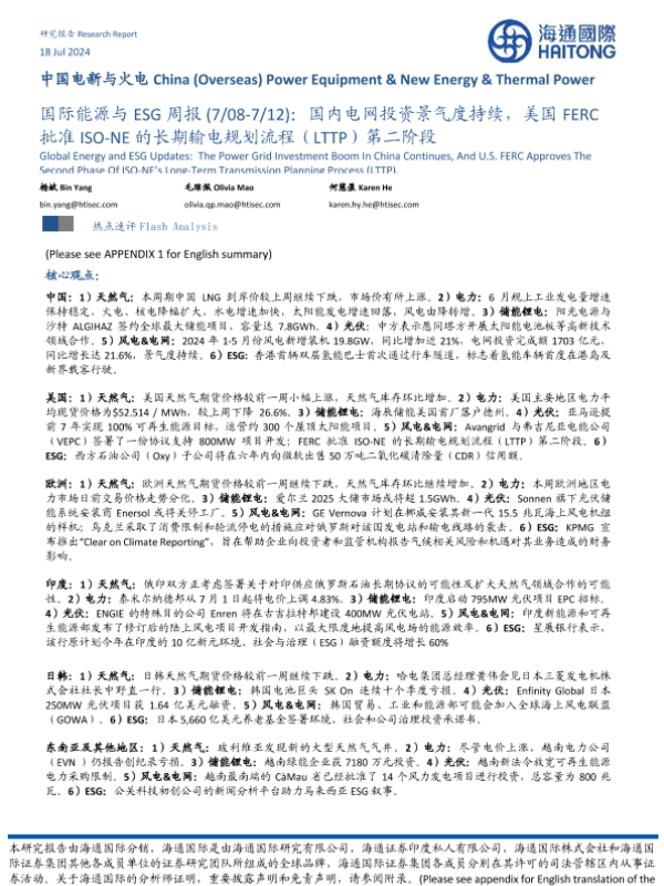【海通国际】【20240718】国际能源与ESG周报:国内电网投资景气度持续,美国FERC批准ISO-NE的长期输电规划流程(LTTP)第二阶段-47页