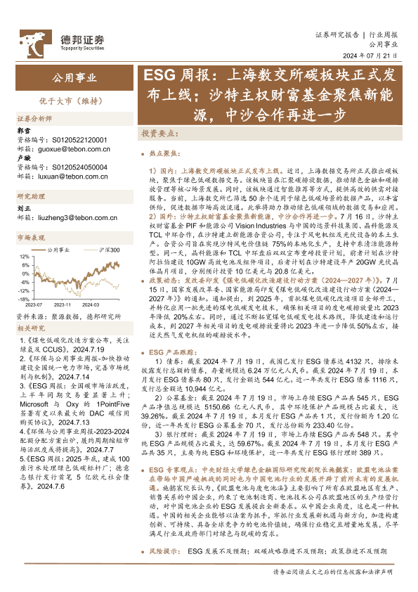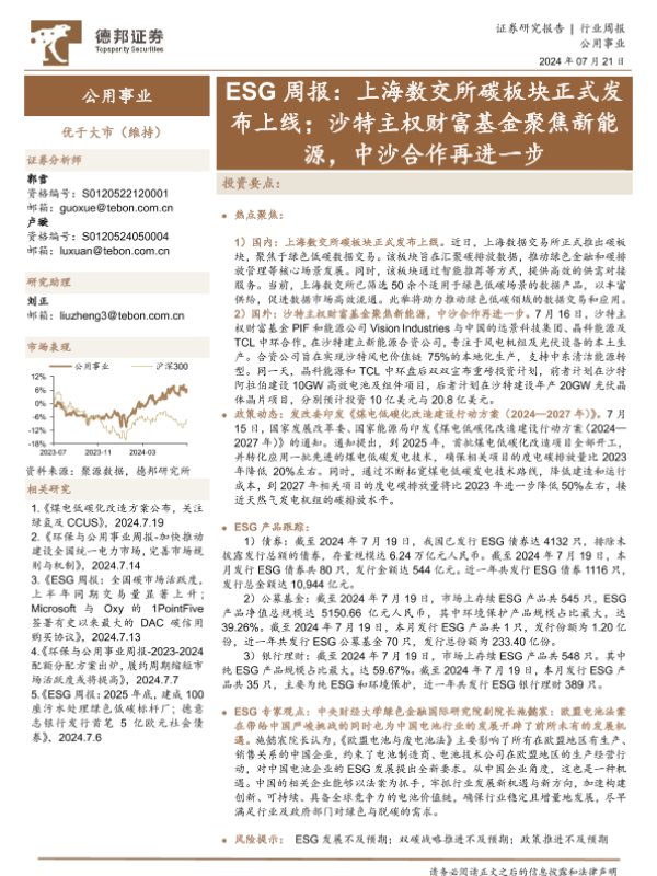 【德邦证券】【20240721】公用事业行业ESG周报:上海数交所碳板块正式发布上线;沙特主权财富基金聚焦新能源,中沙合作再进一步-12页