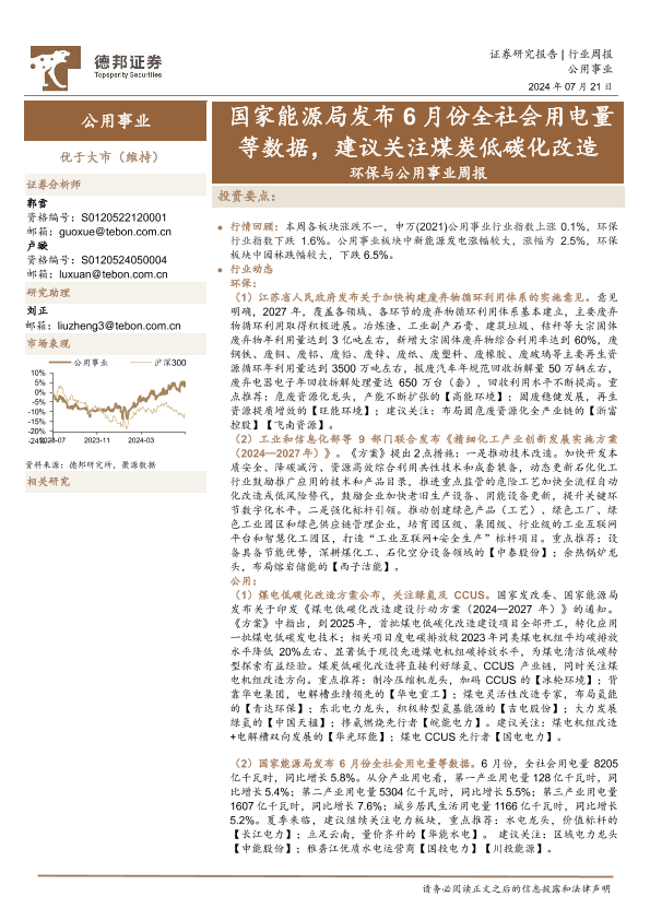【德邦证券】【20240721】环保与公用事业行业周报:国家能源局发布6月份全社会用电量等数据,建议关注煤炭低碳化改造-18页