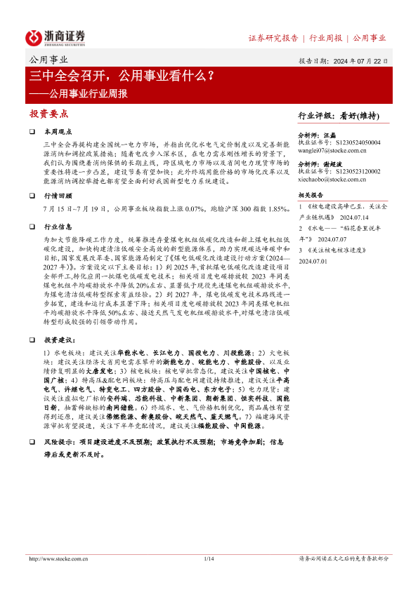 【浙商证券】【20240722】公用事业行业周报:三中全会召开,公用事业看什么?-14页