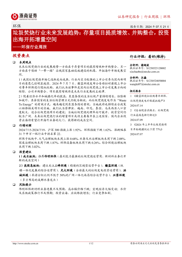 【浙商证券】【20240721】垃圾焚烧行业未来发展趋势:存量项目提质增效、并购整合,投资出海开拓增量空间-12页