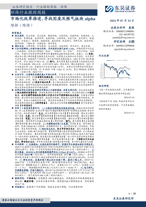 【东吴证券】【20240724】环保行业跟踪周报:市场化改革推进,寻找固废及燃气板块alpha-25页
