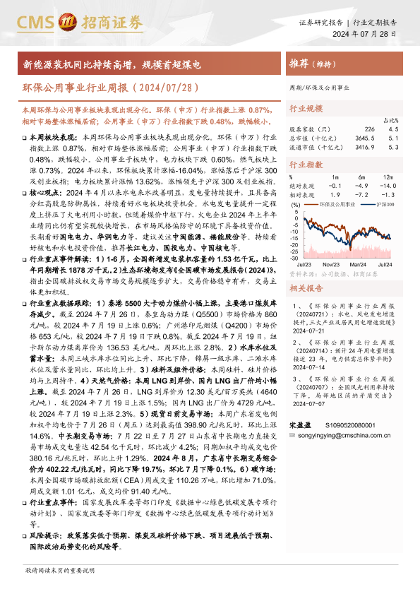 【海通证券】【20240728】环保公用事业行业周报:新能源装机同比持续高增,规模首超煤电-20页