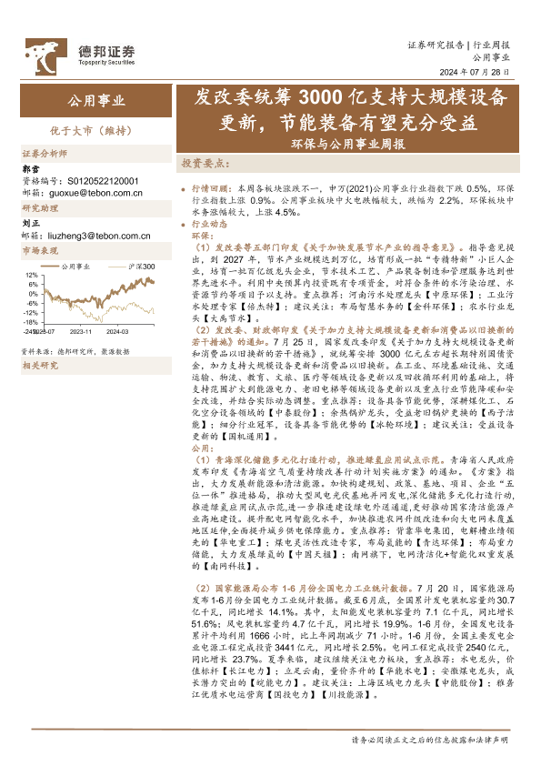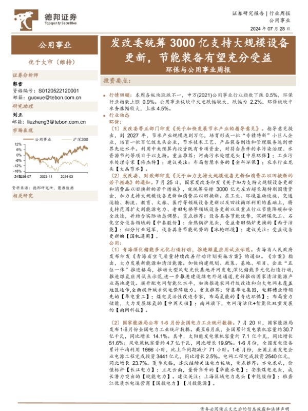 【德邦证券】【20240728】环保与公用事业行业周报:发改委统筹3000亿支持大规模设备更新,节能装备有望充分受益-16页