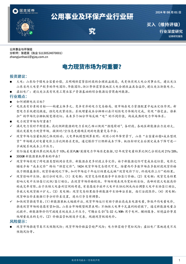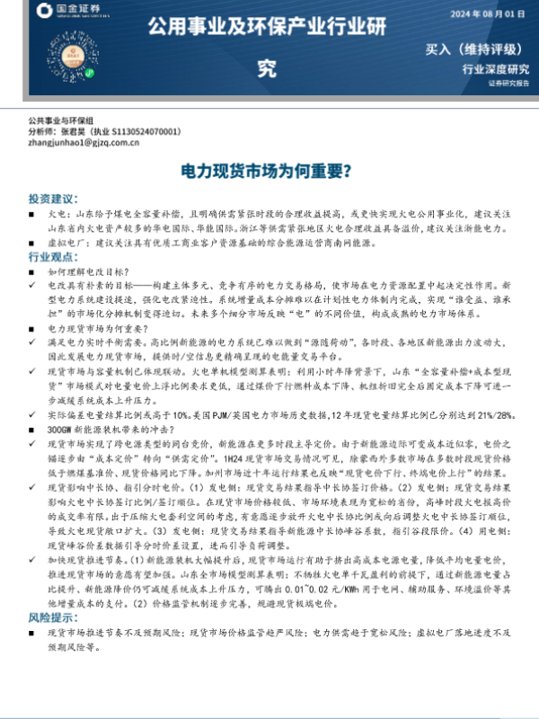 【国金证券】【20240801】公用事业及环保产业行业研究:电力现货市场为何重要?-30页