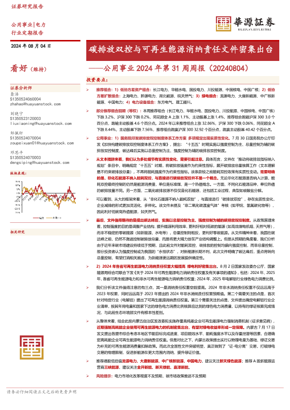 【华源证券】【20240804】公用事业2024年第31周周报:碳排放双控与可再生能源消纳责任文件密集出台-12页