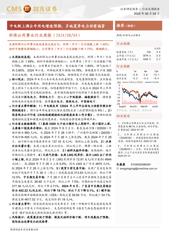 【海通证券】【20240804】环保公用事业行业周报:中电联上调全年用电增速预期,多地夏季电力供需偏紧-23页