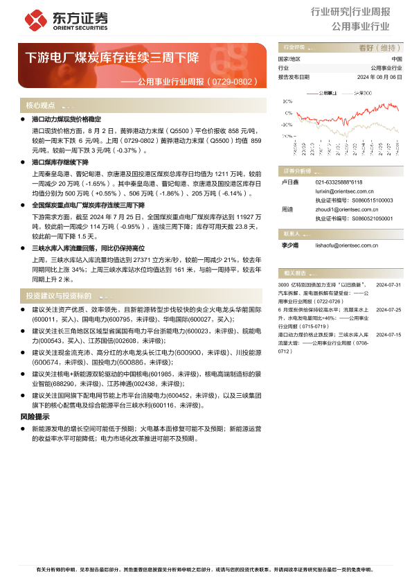 【东方证券】【20240806】公用事业行业周报:下游电厂煤炭库存连续三周下降-15页
