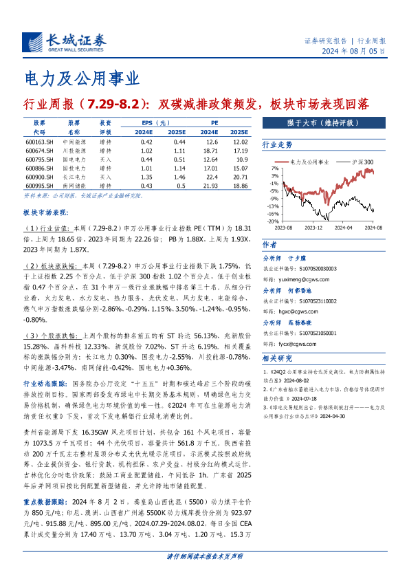 【长城证券】【20240805】电力及公用事业行业周报:双碳减排政策频发,板块市场表现回落-15页