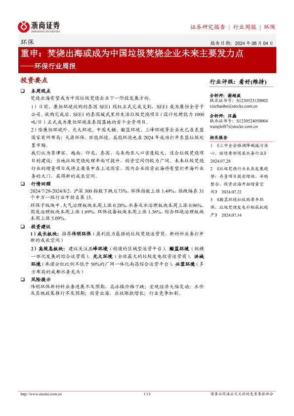 【浙商证券】【20240804】重申:焚烧出海或成为中国垃圾焚烧企业未来主要发力点-13页
