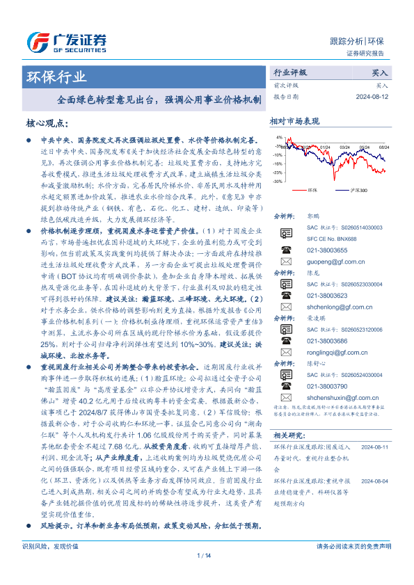 【广发证券】【20240812】环保行业跟踪分析:全面绿色转型意见出台,强调公用事业价格机制-14页