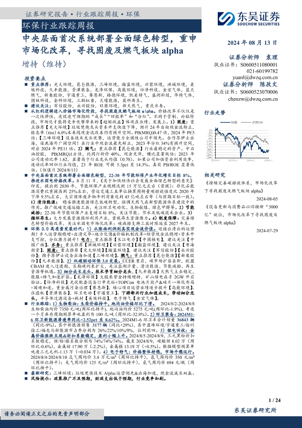 【东吴证券】【20240813】环保行业跟踪周报:中央层面首次系统部署全面绿色转型,重申市场化改革,寻找固废及燃气板块alpha-24页