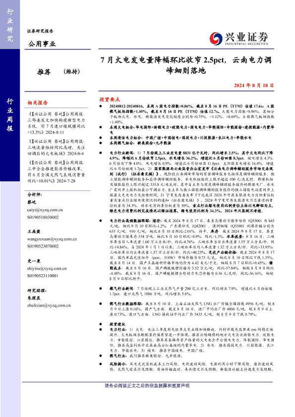 【兴业证券】【20240818】7月火电发电量降幅环比收窄2.5pct,云南电力调峰细则落地-23页