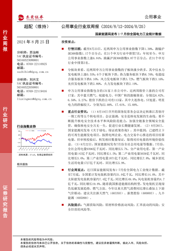 【东莞证券】【20240825】公用事业行业双周报:国家能源局发布1-7月份全国电力工业统计数据-10页