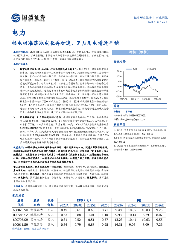 【国盛证券】【20240825】电力行业周报:核电核准落地成长再加速,7月用电增速平稳-14页
