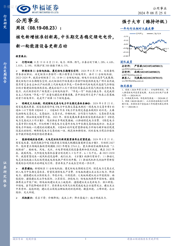 【华福证券】【20240825】公用事业周报:核电新增核准创新高,中长期交易稳定绿电电价,新一轮能源设备更新启动-18页