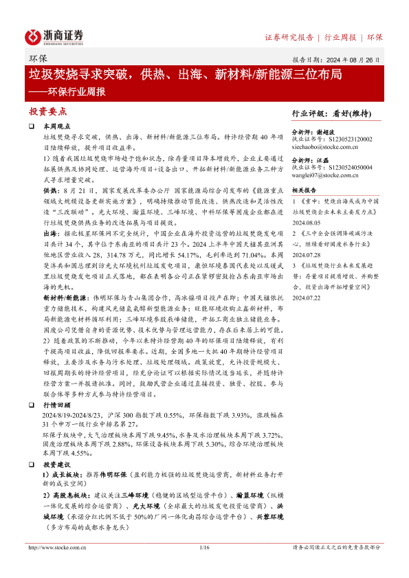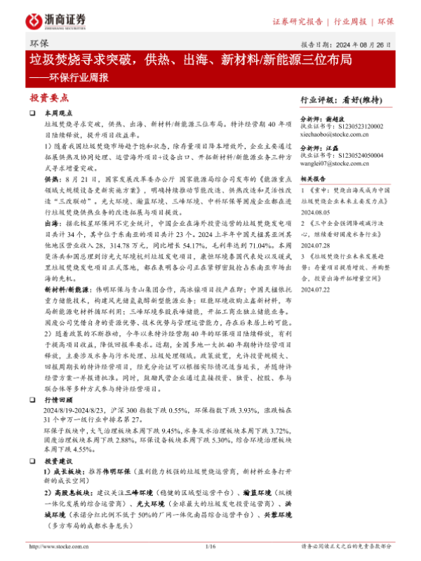 【浙商证券】【20240826】环保行业周报:垃圾焚烧寻求突破,供热、出海、新材料 新能源三位布局-16页