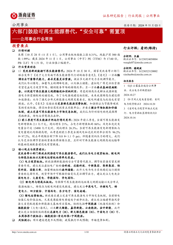 【浙商证券】【20241103】公用事业行业周报:六部门鼓励可再生能源替代,“安全可靠”需置顶-10页